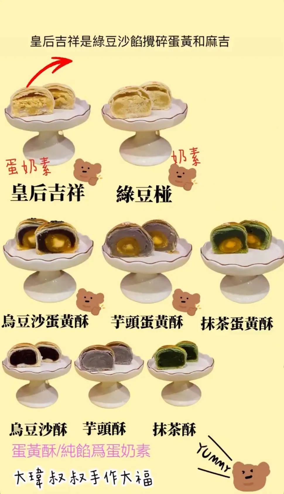 ◆成分:綠豆沙餡,紐西蘭安佳奶油,碎蛋黃,麻糬,紐西蘭安佳奶粉,中筋麵粉,紐西蘭安佳無水奶油(每顆約56~60克+-)